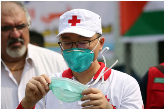 3月16日,在伊拉克巴格达,中国医疗专家展示口罩使用方法。新华社发