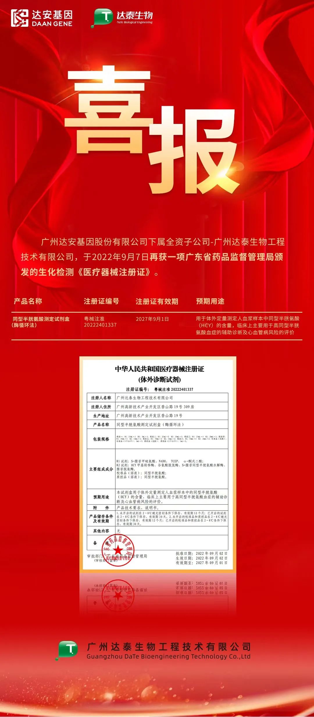 喜讯 | K8凯发旗舰基因下属全资子公司——达泰生物一项产品获批